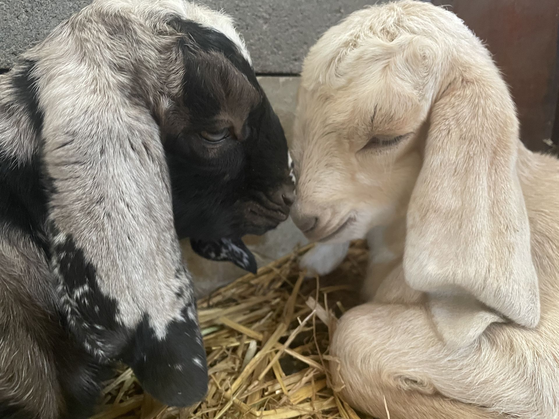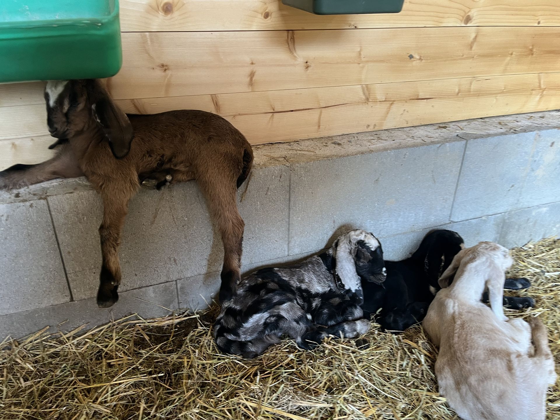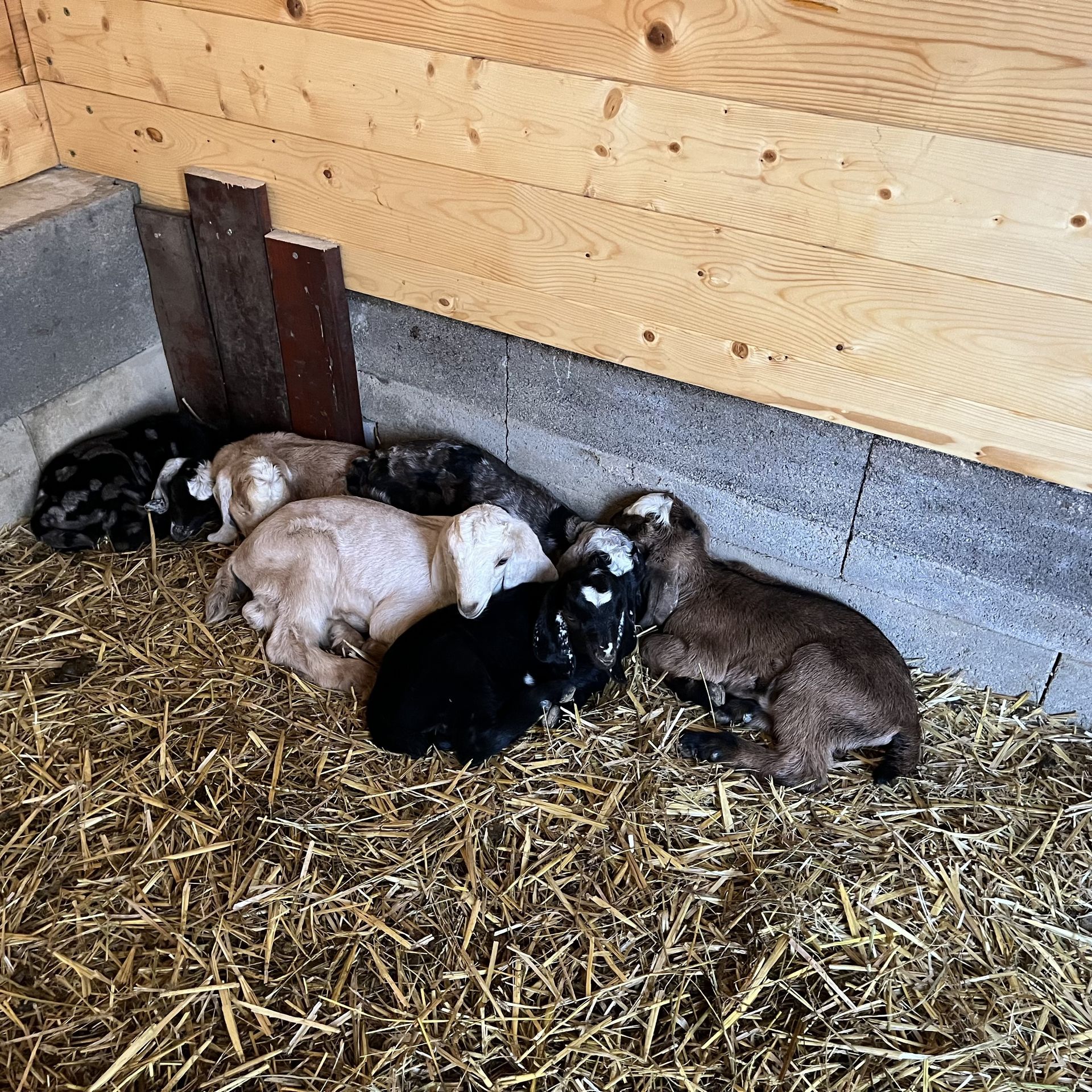 V Zookoutku jsme od roku 2019 a je nám tu krásně. Bydlíme ve stáji pod jednou střechou s lamou Májou a koníkem Vendulkou. Rády mečíme a moc rády mlsáme. Každá z nás má svou osobnost a jméno — říkejte nám Máša, Štěpánka, Gina, Toník, Křemílek a Vochomůrka! Když máme víc mléka, rády se necháme podojit.